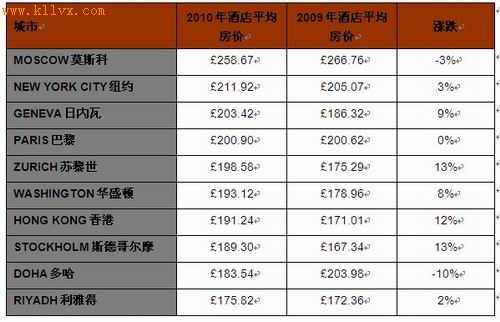 数据显示,相比于2009年同期,2010年全球十大酒店最贵城市出现了很大的变化。2009年不少上榜城市名次下跌。如阿布扎比、麦纳麦、米兰、哥本哈根和雅典,2010年被苏黎世、香港、斯德哥尔摩、多哈和利雅得取代了。