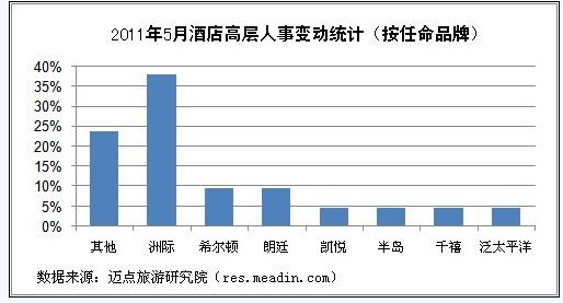 从人事任命的职位来看,本月中酒店高管任命数量最多的是总经理这一职位,根据迈点旅游研究院的统计,本月共任命总经理8位,占全部星级酒店人事任命的38%。其次是市场销售总监,本月总共任命了7位市场销售总监,占全部星级酒店人事任命的33%。本月还有其他一些职位的任命,包括董事长、传播总监、餐饮总监、财务总监和营运规划总经理等。 (3)从任命品牌分析