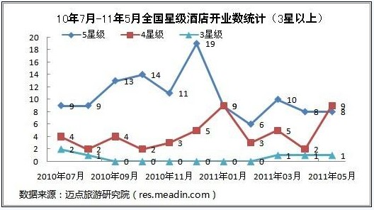 从统计开业酒店的星级分布来看,本月按五星级和三星级建造的酒店数相较于上月没有什么变化,但是按四星级建造的酒店数有较大的波动,相较于上月呈现大幅度上升的趋势。其中,本月按五星级标准建造的酒店,新开业8家,占本月全国星级酒店开业数的44%。而按四星级标准建造的酒店,本月有9家开业,占全国星级酒店开业数50%。(文/皇甫宁) (注:本报告中所标注的“星级”是指投资方对外公布的星级建造标准。) |