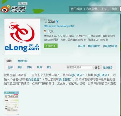 以下是艺龙旅行网的微博账户@订酒店的页面: