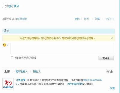 用户只需通过自己的微博账户输入“城市@订酒店” 并发布微博,10秒钟后就可以在“我的评论”内收到该城市的酒店查询链接和预订电话,默认的入住日期为查询日期的次日,入住1晚。回复的信息内还包括艺龙的预订电话400-666-1188,此电话号码不同于艺龙网站的电话400-616-1616,很明显艺龙已经开始独立追踪此渠道的预订转化。以下是笔者查询的广州酒店的信息反馈: