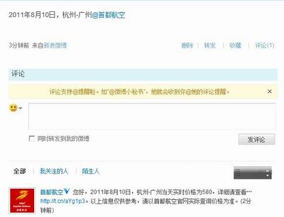 用户只需通过自己的微博账户输入“XXXX年X月X日,城市对@首都航空”并发布微博,约35秒后就可以在“我的评论”内收到最低票价的反馈结果和页面查询链接。以下是笔者查询的“2011年8月10日,杭州-广州“的票价查询结果,回复信息显示当日此航线最低票价为580元,点击其中的链接就可以查看实时的航班和票价信息。在8月1日晚,笔者先后进行了两次测试,但是从目前的信息回复速度来看(两次信息反馈的速度都在30秒以上),不能确定后台是不是通过人工查询来进行反馈。