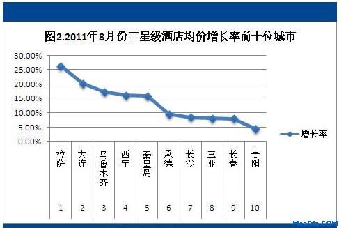 时间:2011-8-12 9:23:31 来源:金羊网| 旅游网站同程网发布了《2011年8月份酒店价格指数报告》(下称《报告》)。《报告》显示,8月份是暑期最为火热的一月,也是出游的火热月,相对于7月份,酒店均价保持上涨趋势,整体增长率为3.42%,其中低星级酒店的增长率较高;在三星级酒店增长率前十城市排名中,拉萨居首,大连[注: 大连市-大连是辽宁省第二大城市,东北地区经济发达城市。大连地理位置优越,位于中国辽东半岛最南端,东濒黄海,西临渤海,处于环渤海地区的圈首,]位居第二;经济型酒店增长率排名前十的城市中,秦皇岛[注: 秦皇岛市-位于河北省东北部的秦皇岛,距首都北京281公里,北依燕山,南临渤海,东与辽宁省接壤,西与唐山市毗邻,秦皇岛因秦始皇东巡驻于此,并派人从这里渡海求仙而得名。]涨幅最大,在80%以上。 8月各类型酒店均价持续上涨 图1 如图1所示,2011年8月份各类型酒店的预订均价再次上涨。在7月份酒店均价的基础上,8月份酒店价格有3.42%的增长,其中以三星级和二星级酒店的价格增长最为显著,五星级酒店及经济型酒店增长幅度不大,主要在于7月份这两类酒店的增长较大,8月份增长幅度相对较小。 值得关注的是,8月份,三星级和二星级酒店均价的增长比例较大,从同程网酒店预订[注: 在酒店在线预订方式上,美国有70%的网民会通过互联网在线预订的方式进行酒店预订,但在中国,这个比例仅为15%,市场发展的潜力巨大。]中心分析来看,大部分游客出游的酒店选择以经济型和五星级为主,在出游旺季,热门旅游目的地酒店供不应求的情况下,不少游客则会退而选择服务较好、评价较高的低星级酒店。另外,不少低星级酒店也在不断提升自身的服务及设施来接纳更多的旅客。 三星级酒店均价增长排名,拉萨居首 图2 |