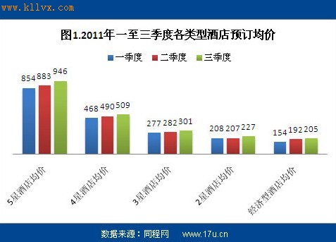 如图1所示,2011年一至三季度,各类型酒店的预订均价呈现稳步上升趋势,进入三季度后,由于暑期出游旺季的影响,酒店价格增幅明显高于二季度,特别是五星级酒店,增幅为7.13%。虽然三季度整体处于增长水平,但9月份酒店价格较8月份却呈现下降趋势,如下图2所示。