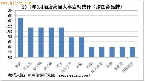 (3) 从任命品牌分析 统计数据显示,本月雅高品牌的任命最为活跃,总共任命了4位高管,占全部星级酒店人事任命的15%。喜达屋、希尔顿、卡尔森品牌的任命也较为活跃,各有3位高管任命,各占总数的12%。其他有任命的品牌有马哥孛罗、朗廷、洲际、凯宾斯基和凯悦等。其中国内品牌有1位高管任命。