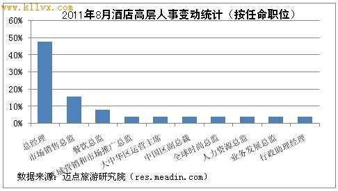 (2) 从任命职位分析 从人事任命的职位来看,本月中酒店高管任命数量最多的是总经理这一职位。根据的统计,本月共任命总经理12位,占全部星级酒店人事任命的48%。 其次是4位市场销售总监,占星级酒店人事任命的16%。此外还任命了2位餐饮总监,占全部任命人数的8%。本月还有其他一些职位的任命,包括运营主席、区域总裁、时尚总监、人力资源总监等。