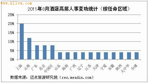 时间:2011-9-13 10:18:23 来源:迈点网| 2011年8月,总计达5982家星级酒店企业中,共有23家酒店(集团)任命了25位酒店高管,任命人数较上月相比增加了3人。 (1) 从任命分布区域分析 统计数据显示,本月人事变动最频繁的地区是上海,总共任命了5位高管,占全国星级酒店人事任命总数的20%。本月云南地区人事任命也较为活跃,总共有3位高管的任命,占总数的12%。其次是广东、北京地区,各有2位高管的任命,各占全部星级酒店人事任命的8%。本月还有其他一些地区有人事任命,如图中所示有山东,海南[注: 海南省-海南(英文名:Hai Nan),省会:海口,简称:琼。 海南省-1988年4月13日,第七届全国人民代表大会第一次会议通过《关于设立海南省的决定》和《关于建立海南经济特区的决议》;1988年4]等地。值得关注的是本月还有1个全球的集团高管任命,2个中国地区和1个大中华区的集团高管任命。