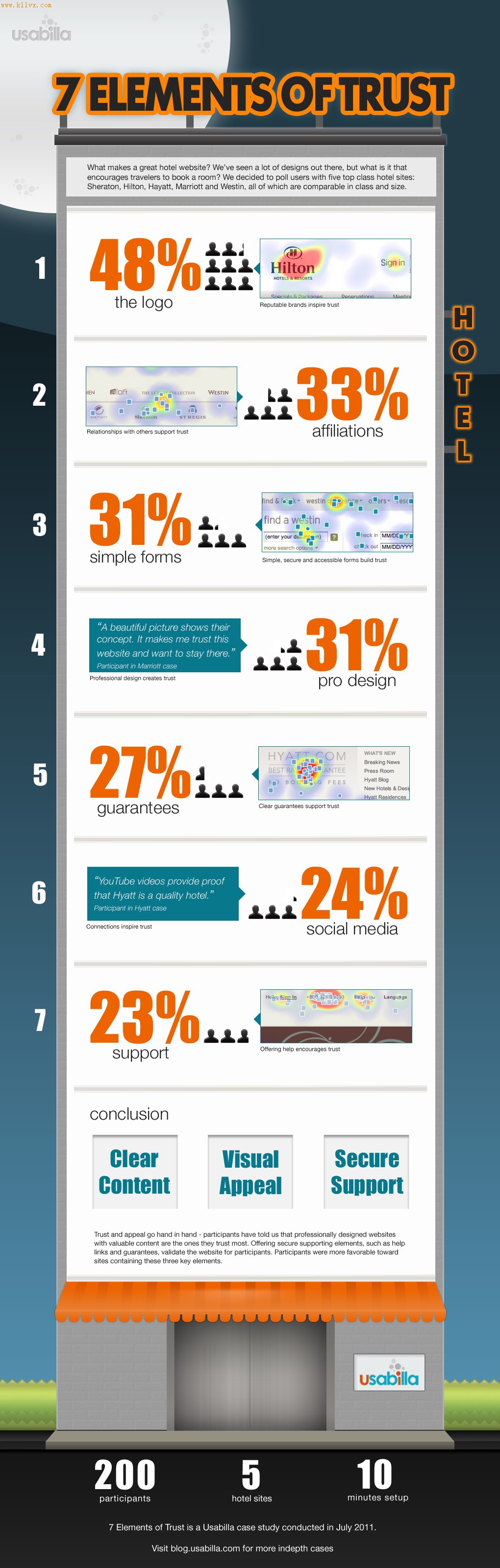 时间:2011-9-23 11:30:30 来源:环球旅讯| 近日Usabilla的一项研究表明,促进酒店网站建立用户信任度的首要因素是酒店的Logo和品牌关注度,其他因素包括合作关系、质量保证、网站设计等。 除了酒店的Logo和品牌关注度,与其他公司的合作也能帮助建立访客信任度,合作伙伴的Logo应该放在酒店主页很显著的位置。 酒店网站的专业设计也很重要。漂亮的酒店物业和服务功能图片也很吸引访客,并勾起他们的购买欲。 设计简单、安全、容易使用的网站能够帮助建立访客信任度。 顾客评价高的酒店也能为访客提供保证,例如最优惠价格保证以及不收取预订费等。 社会媒体是建立品牌和网站访客信任度的另一重要因素,建立YouTube视频展示酒店产品及服务,还可以加入对以往客人的视频采访等,这些都有利于激发信任度。 在你的网站上设置常见问题解答和帮助信息,方便访客能够更快的找到一些常见问题的答案。此外,优质的客户服务也帮助建立信任度。 以下图表更详细的展示了Usabilla 调研(关于建立酒店网站访客信任度)的7大原因,对于此事,您有什么看法?还有其他的因素没有被包括在内吗? 请点击图片查看大图。