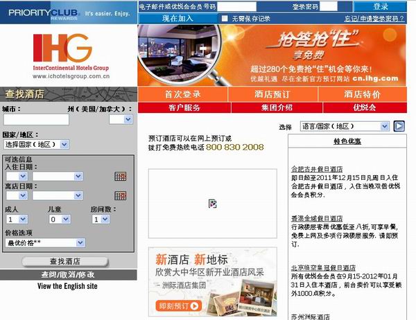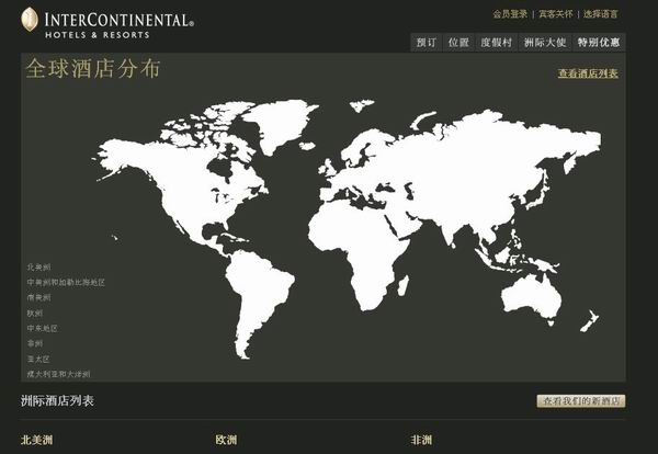 图二:洲际酒店集团中文版网站首页 相比原有的洲际酒店集团中文版网站(见图二,下简称“集团网站”),新版网站首页中部以大幅图片替换了原网站的小图片和促销信息。 另外,两个网站首页虽然同样提供酒店查找功能,但新版网站可以直接为用户提供洲际酒店在国内某个城市空房信息,而集团网站则需要用户从全球选择入住城市,碰到城市同名的情况,还需要在同名城市里选择真正入住城市,接着还要到该城市洲际集团旗下品牌酒店查看房态。 新版网站则将洲际酒店全球酒店分布和各酒店页面入口,移到首页右下角的各地“酒店信息”,以及首页“位置”导航键(见图三)。用户可以查看全球洲际酒店信息和进行预订。