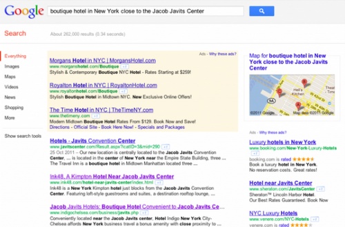 通过关注品牌性质和地理位置,会产生四种结果: 尽管广告仍然存在,但是具体的酒店品牌网站占了主导地位(这个例子中如morganshotel.com、royaltonhotel.com和thetimeny.com); 点击付费的成本更低; 自然搜索结果中,独立酒店品牌网站占主导地位(排名第二和第三的分别是ink48.com和indigochelsea.com)。 你的酒店在地图上显示的几率较高; |