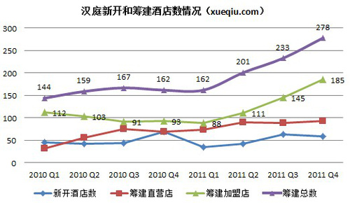 时间:2012-3-10 9:58:21 来源:雪球财经 吴桑茂| 汉庭刚公布了2011年Q4财报,得益于入住率恢复和门店数量46%的增长,其营收获得了43.8%增幅,至人民币6.5亿元。2月29日重回CEO职位的季琦在财报中表示,汉庭成熟的品牌实力和完善的酒店管理平台,能够继续吸引越来越多的加盟商;释放出了加速扩张的信号。不过财报中并未更新2012年的开店计划;上季度财报汉庭表示将新开不少于200家店。 从汉庭2011年新增201家酒店数看,刚好完成了他一年前定下的新开200家店的目标;不过对比7天和如家的开店数(他们3月9日才公布财报,笔者根据他们网站计算的数据分别是400家和300家),汉庭的开店速度依然相对较慢。、