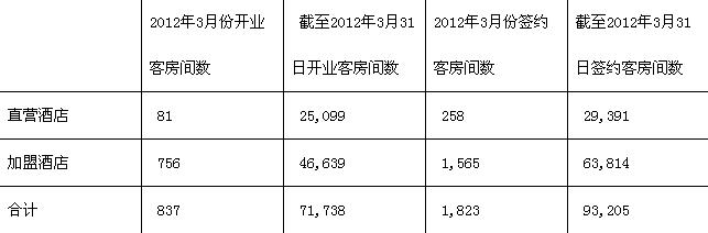 2、按直营和加盟分的2012年3月份和截至2012年3月31日连锁经济型酒店开业和签约客房总数 表二 单位:间