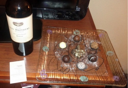 当我回到客房时,我发现员工已经将巧克力和红酒送到了我的客房。