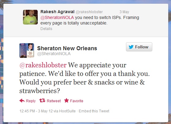 我曾在一条微博上说明了我用美国运通喜达屋信用卡累积消费了66万美元。喜达屋集团的工作人员回复了我的微博,并问我将如何使用喜达屋的积分。 于是我使用了积分来入住新奥尔良喜来登酒店,当我发布有关这一信息的微博时,该酒店的社会媒体经理回复了这条微博,并问到我的入住情况。 我回答说我在使用酒店的互联网服务时遇到了一些麻烦,新奥尔良喜来登酒店的社会媒体经理表示了歉意,并问我更喜欢红酒和草莓还是啤酒和零食,他/她称酒店员工会把它们送到我的客房。
