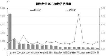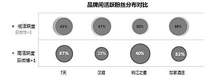 粉丝属性也是微博运营评估的维度之一。多数经济型酒店品牌的新浪微博男性粉处于绝对领先地位,而7天连锁酒店的粉丝两性比例则较均衡。从粉丝地域特征分析,7天连锁酒店粉丝主要集中在华南地区,广东粉丝数超过6000,北京位居第二。由于北京是7天连锁酒店旗下第一个达到“同城百店”的城市,所以7天在北京的粉丝增长也最快。