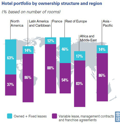 时间:2012-9-28 12:21:34 来源:i美股| 下图是不同地区的运营模式构成的结构分析,北美地区和欧洲其他地区(除法国)主要采用的是自有酒店和固定租金的运营模式(固定租金在盈利结构上类似于自有酒店,在支付固定租金之后可以拥有剩余利润的所有权),其他地区的运营模式主要以提供管理服务、特许经营权以及可变租金的模式运营。