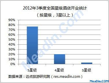 (2) 开业酒店星级分布 从开业酒店星级分布来看,2012年7-9月新开业的星级酒店中,与上一季度相比,五星级酒店数量有所上升,本季度开业了49家,同时在全国星级酒店开业数中的占比也直线上升,比例为77%。本季度四星级酒店有所下降,共有13家酒店开业,约占全国星级酒店开业数的20%。从每月的星级酒店开业情况来看,五星级酒店的主导地位几乎是雷打不动的,一个五星级酒店的入驻有不少好处。五星级酒店是“资本密集型+人工密集型”行业,不仅可以改善投资环境、提高城市知名度,发展当地旅游业,还可以给地方带来大量投资、增加地方政府财税收入、扩大当地就业。近来年,星级酒店已成为城市化的标志,各地投资商竞相投资高星级酒店产业。