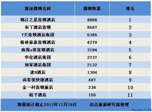 时间:2013-1-6 16:19:03 来源:迈点网| 随着微博用户爆发式的增长,微博营销的低成本、高速度、大影响等价值逐渐被挖掘出来。微博的出现俨然已经引发了互联网的一场新战争。不少星级酒店和连锁品牌也都纷纷晋身到微博大军之中。不管是经济型还是国内、国际联号都纷纷入驻微博。同时我们也可以在新浪微博上发现,许多国内连锁性质的经济型酒店通常采用集团注册微博的形式,如7天、如家、速8等;而一些国际型的酒店管理集团很难看到,但其旗下的国内营业的高星级酒店则非常多见,如无锡华广场酒店(万豪国际酒店集团)、香港酒店(喜达屋国际酒店集团)、济南索菲特银座大饭店(雅高集团)等。 随着中国经济型酒店市场竞争日趋白热化,特别是经济型酒店,各家经济型酒店无论在门店扩张还是增加营收渠道上都将进一步发力。在迈点品牌指数(MBI)中的经济型酒店品牌,一些品牌,例如国际青年旅社、宜必思、佳园连锁和中州快捷,这几个品牌有些是还未在新浪上开通该品牌的官方微博,主要是以某单店微博的形式存在,或虽然开通了但还未被机构认证过。而通过新浪机构认证同时在新浪微博上又有其官方微博的品牌/集团分别有华住酒店集团、7天连锁酒店集团、如家酒店集团、格林豪泰连锁酒店、布丁酒店连锁、速8酒店、南苑e家连锁酒店、桔子酒店、尚客优快捷酒店和金一村连锁酒店。下面就以上提到的这些酒店就其微博营销的现状进行简单的分析。 酒店微博粉丝数