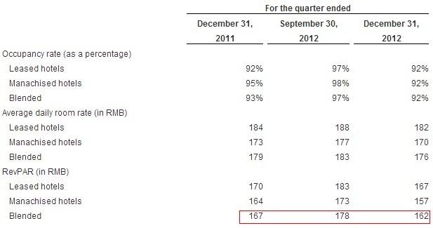3、不含星程加盟门店,汉庭四季度RevPAR(每间可供出租客房收入)为162元人民币,去年同期为167元,同比下降3%; 4、运营时间超过18个月的成熟门店的RevPAR为179元,同比增长2%(包含了1%的ADR数量增长和1%的汇率增长)。