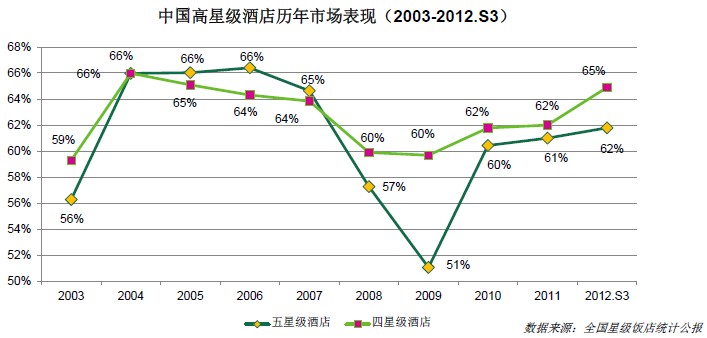 如图所示,中国四星级及五星级酒店的分布主要集中在沿海地带,从东部地区向西部地区延伸。广东、北京、江苏、浙江和上海得益于它们较高的政治或经济地位,商务氛围浓厚,因此具有最多数量的五星级酒店;河北、山东及四川因为拥有大数量的四星级酒店,其高星级酒店总量也名列前茅。 高星级酒店历年市场表现 过去十年,四星级与五星级酒店的住宿率走势大体相似,在经历全球经济危机后,四五星级酒店的住宿率均有所回升。