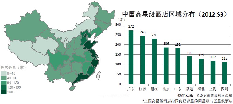 政府近年来加大了星级酒店的检查力度,一批四星级酒店由于不达标准而被摘星,导致近两年四星级酒店的数量不增反减。 高星级酒店区域分布