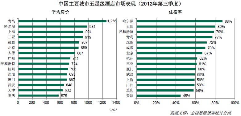 如图所示,在我们统计的主要城市中,青岛、哈尔滨、上海、三亚、成都与北京的五星级酒店具有较高的平均房价,而哈尔滨、太原、呼和浩特、青岛、沈阳与成都具有较高的住宿率。