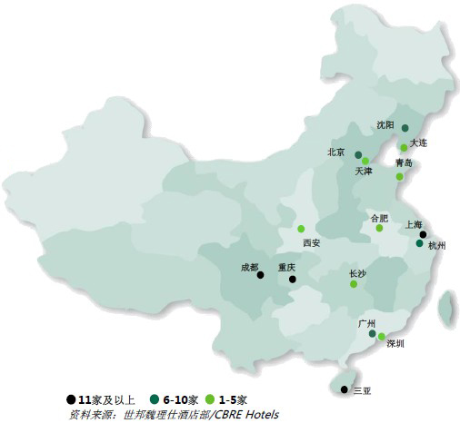 如图所示,在未来三年里,高星级酒店项目保持了从沿海一线城市向二、三线城市拓展的趋势,将在成都、重庆、长沙等地开设多家高星级酒店。 2013至2 |