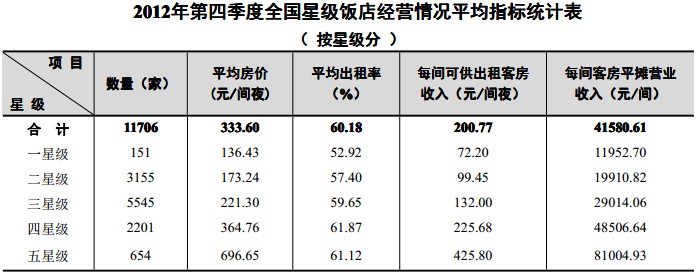 全国第四季度星级饭店平均房价为333.60元/间夜,平均出租率为60.18%,每间可供出租客房收入为200.77元/间夜,每间客房平摊营业收入为41580.61元/间。