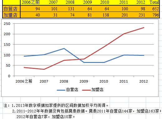 我们可以用图表来反映一下这三家公司过去几年加盟店与自营店的扩张情况。先看看七天连锁集团经济型酒店扩张情况。