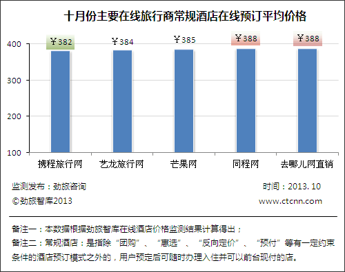 图二:五家主要在线旅游网站在线酒店预订均价(2013年10月监测) 虽然去哪儿网曾高调宣称自己直销酒店的签约数量早已超过5万家,并有6000家独家酒店,并于不久前,又以品牌联盟的形式接入Hotelspro的全球近20万家酒店,但由携程、艺龙十余年时间建立起来的行业壁垒并非短时间能攻破,此时的去哪儿依旧需要韬光养晦,一方面招兵买马、快速优化内部流程、蓄势待发,同时也需要广告主携程、艺龙的广告费支持。 不管去哪儿网如何掩饰,在线旅游市场CEQ(Ctrip、Elong、Qunar)格局已经真切的形成,酒店预订业务势必将成为未来三家大战的主战场,谁能笑到最后,还未可知。 |
