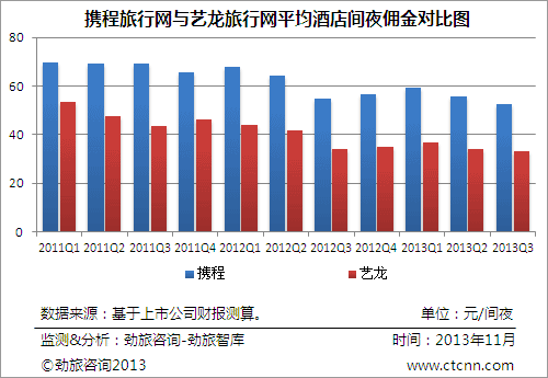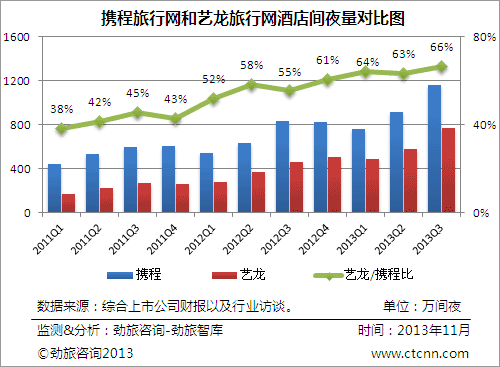 图1:2012年以来携程旅行网与艺龙旅行网酒店预订业务营收对比 通过对比携程旅行网与艺龙旅行网酒店预订业务营收的状况,艺龙经过2012年以来几个季度的波动,在第三季度再次将增长幅度大大领先于携程。而携程方面,自2012年第三季度,在扭转了2012年第三季度以前增速持续减慢的颓势后,已经保持了连续4个季度持续提速的状态。