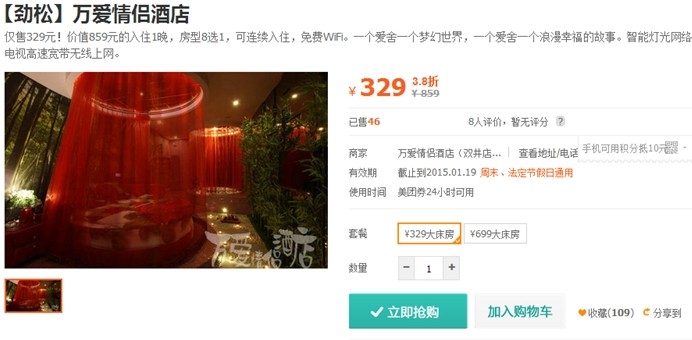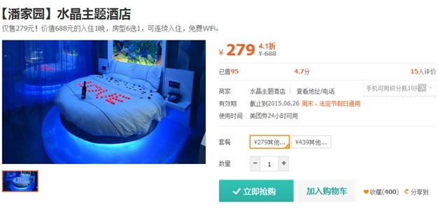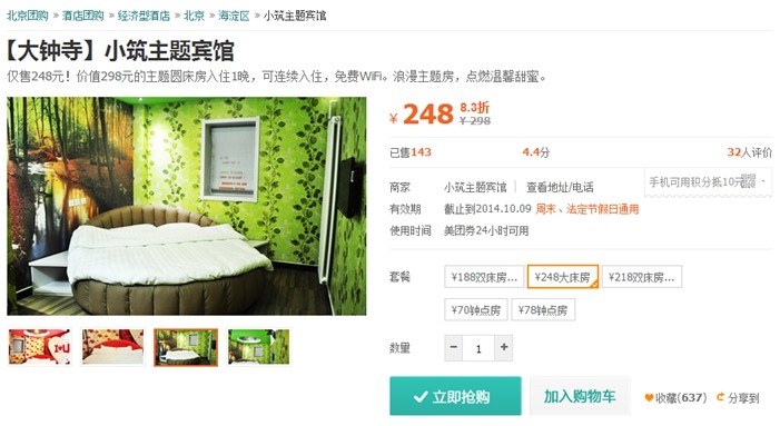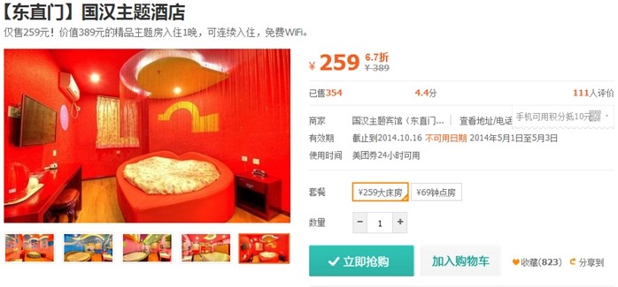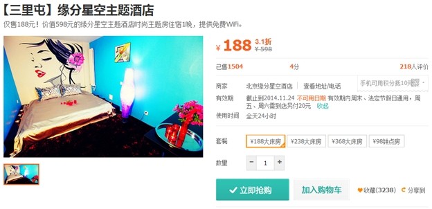 时间:2014-08-02 10:07:47 来源:不详 缘分星空主题酒店(三里屯) 缘分星空主题酒店是一家以情侣为主题的酒店,位于三里屯机电学院南门,周边有朝阳医院、三里屯酒吧街、滚石、CN酒吧、夜宴等大型娱乐场所,去往农展馆、国贸中心、蓝岛商城、燕莎友谊商城交通十分便利。周边公共设施齐全,位置十分优越。 美团价:188元(周五、六需加20元)小筑主题宾馆(大钟寺) 在北京有个特色主题宾馆叫“小筑”。 在嘈杂混乱的北京想拥有一份优雅和平静的童鞋们那就来“小筑”。 “小筑”是一个文艺青年,它还非常会浪漫,更是爱情的催化剂,更能让爱情升温。 美团价:248元水晶主题酒店(潘家园) 全新的时尚创意配以精致的浪漫元素,水晶主题酒店打造出28款不同爱的主题:激情邂逅的“罗马假日”、热辣奔放的“蝶舞迷情”、神秘异域的“一千零一夜”、温馨沉静的“水晶之恋”、“阑珊羽夜”、“星语心愿”.每一种主题都有不同的爱的感受。可谓是风情万种。美团价:279元 国汉主题酒店(东直门) 国汉宾馆位于春秀路和东直门外小街的交叉口胡家园小区,邻近东直门交通枢纽站、各国使馆区,周边休闲、购物十分便利。,客房温馨、舒适、整洁、干净,提供24小时热水、免费上网,热情,周到的服务是宾客旅行的理想选择,让宾客拥有回家的感觉。 美团价:259元万爱情侣酒店(劲松) 中国情侣酒店缔造者——万爱情侣酒店,浪漫更加爱你。 双井店豪华浪漫的世界旗舰 2014年万爱情侣酒店双井旗舰店盛大开业!作为万爱在北京的第五家分店,万爱双井店不仅是国内面积最大,房间最多的情侣酒店,更是世界情侣主题酒店的典范。 美团价:329元 |