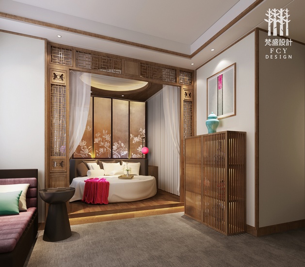 【巧妙演绎“蝴蝶元素” 隐喻婺州“两面人生”】图中“蝴蝶元素装饰的花格”窗屏像极了婺剧开场缓缓拉开的帷幕,也正是江南老房子的床屏设置;后面那道智能控制的窗帘,每当顾客进入房间自动掀开的刹那,更有蝴蝶翅膀般拍打的节奏,告诉你这里即将上演的故事…浪漫还是传奇?传统的木质与现代的大圆床相融合,碰撞出独特的风味。浓厚的自然气息与实木质感,在传统与时尚的交融之中营造出生活的温馨与浪漫。