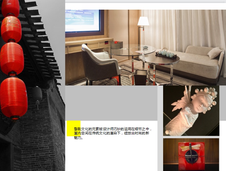 【融入江南传统文化 谱写特色“婺剧传奇”】梵盛酒店设计有限公司创始人金文斌先生谈到:“文化不是用来装饰的,而是用来体验的。”婺剧文化的体验,不仅是在酒店大堂摆几张脸谱,在墙上手绘墙绘那么简单。如何体验文化,相信大家会有自己不同的理解。更重要的是应深入当地生活,了解当地百姓的“生活方式”,加以艺术升华,融入设计。