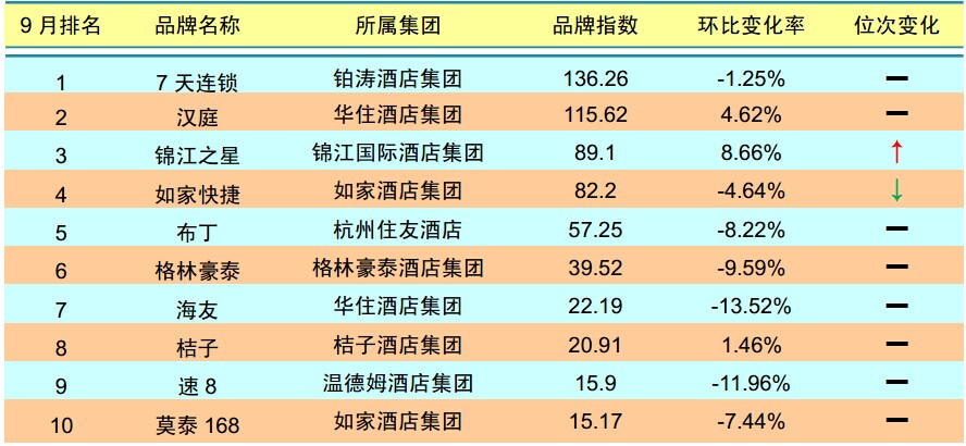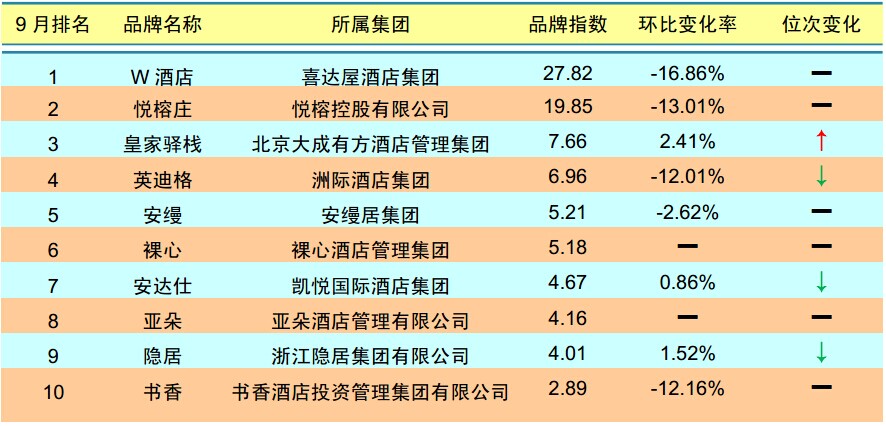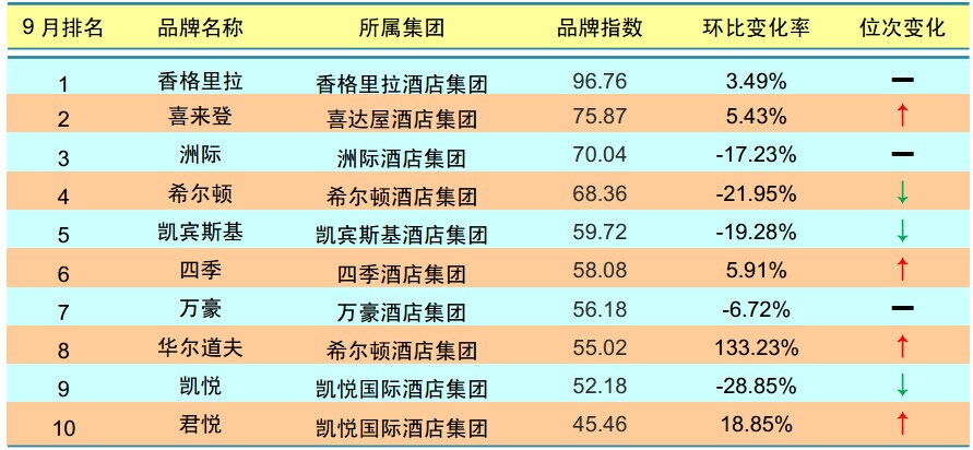 时间:2014-11-10 23:12:13 来源:不详 一、9月各榜单品牌指数变化状况 9月迈点旅游研究院共监测酒店品牌159个,其中国际品牌47个,国内品牌31个,经济型品牌31个,中档品牌30个,精品品牌20个,较8月新增3个品牌,分别是中档品牌的五悦和精品品牌的裸心和亚朵。本月监测的品牌中,共有47个品牌品牌指数环比实现增长,占品牌总数的29.56%,也就是说,绝大部分酒店品牌的品牌指数较8月都有所下降。上升的品牌中,其中国际品牌共有12个,占比25.53%;国内品牌7个实现上升,占比22.58%;经济型品牌12个,占比38.71%;中档品牌9个,占比30%;精品品牌7个,占比35%。从占比上来看,9月经济型品牌的上升相对较多,其次是精品品牌和中档品牌。这表明经济型品牌在本月的品牌推广成效比较显著。 从品牌指数来看,9月国际品牌总指数为1211.75,环比下降10.19%。9月国内品牌总指数为326.53,环比下降12.92%。9月经济型品牌总指数为698.75,环比下降0.85%。中档品牌9月总指数为178.73,环比下降5.40%,精品品牌9月总指数为100.53,环比下降5.76%。从品牌总数总值来看,9月各类品牌较8月都有所下降,其中经济型品牌环比下降最少,最大的是国内品牌。 二、各榜单品牌环比升降TOP3 从具体品牌来看,国际品牌中以华尔道夫品牌指数环比上升为最快,达133.23%,温德姆和君悦分列二、三,环比上升分别为26.73%、18.85%。世尊、丽晶和最佳西方品牌指数在下降的品牌中名列前三,降幅分别为65.99%、59.62%、54.63%。 国内品牌中,粤海、恒大、华天环比增幅名列前三,分别是63.67%、44.56%、25.98%,绿地、碧桂园假日、锦江列环比降幅前三,分别是70.18%、51.46%、35.21%。 经济型品牌中,城市之家、易佰连锁、99旅馆环比增幅名列前三,分别是49.94%、46.81%、41.01%,海航快捷、都市118、粤海之星列环比降幅前三,分别降幅43.52%、26.33%、18.62%。 中档品牌中,智选假日、麗枫、富驿环比增幅名列前三,增幅分别为49.40%、35.54%、27.53%。澳斯特、喆啡、丽亭品牌指数环比下降名列前三,分别是60.87%、47.73%、47.33% 精品品牌中,罗莱夏朵、花间堂、大禹·开元品牌指数环比增幅名列前三,分别是18.45%、12.22%、8.15%,美憬阁、雅阁璞邸、有园品牌指数环比降幅名列前三,分别是87.90%、53.66%、33.03%。 三、MBI各榜单TOP10 (1)国际酒店品牌风云榜TOP 10