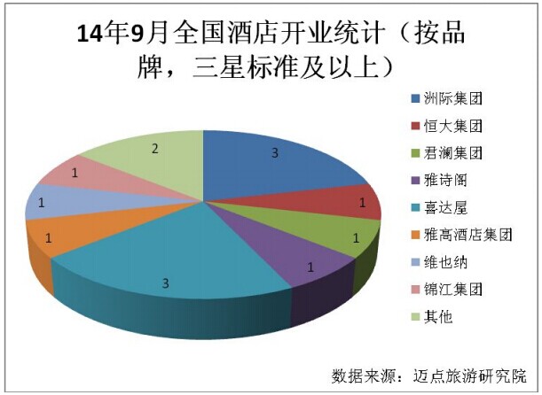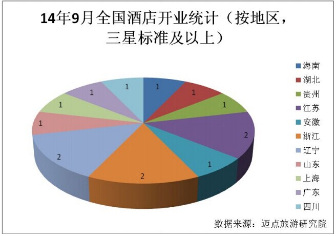 时间:2014-11-10 23:15:31 来源:不详 据迈点旅游研究院对国内酒店开业情况的不完全统计,2014年9月,国内开业的酒店数14家,客房总数约为3387间(套)。与上月相比,本月新开业的酒店总数减少了2家,降幅为12.5%;客房总数减少了约1059间(套),降幅为23.82%。本月开业酒店中,五星级标准酒店10家、四星级标准4家。 (1)开业酒店区域分布 就开业酒店分布的区域来看,本月共有11个地区有新酒店开业。其中开业最多的地区是浙江、辽宁和江苏,三地9月共开业酒店2家,占全国开业数的42.86%,此外,海南、湖北、贵州、安徽、山东、上海、广东、四川等地各有一家酒店开业。从地域上看,沿海地区开业酒店数和内陆地区开业酒店数各是7家,分别占50%。