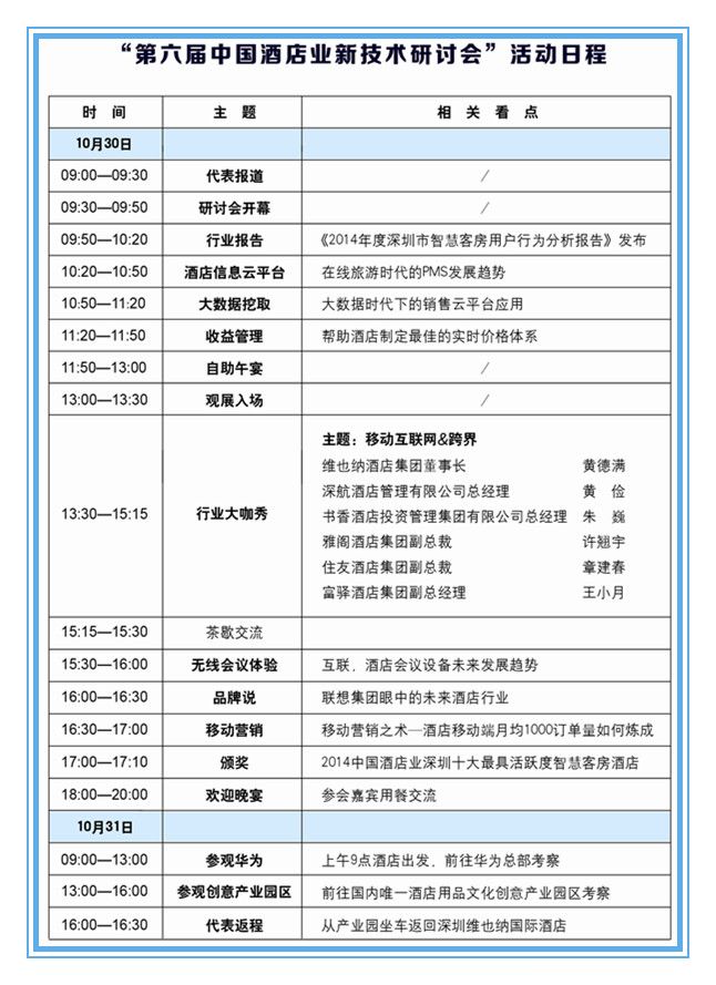 时间:2014-11-10 23:15:36 来源:不详 第六届中国酒店业新技术研讨会脚步渐近(10月30日,深圳维也纳国际酒店),会议运作团队所有成员正全力以赴做好最后的准备工作,以期给各大酒店管理者、业主代表及服务商代表带来最完美的科技盛宴和最充分的业界交流。 目前,大会活动日程已新鲜出炉。请各位参会者拭目以待,届时主题演讲、跨界对话、新技术产品展出、华为总部及恒安兴创意园考察参观,定将不负你的期待。