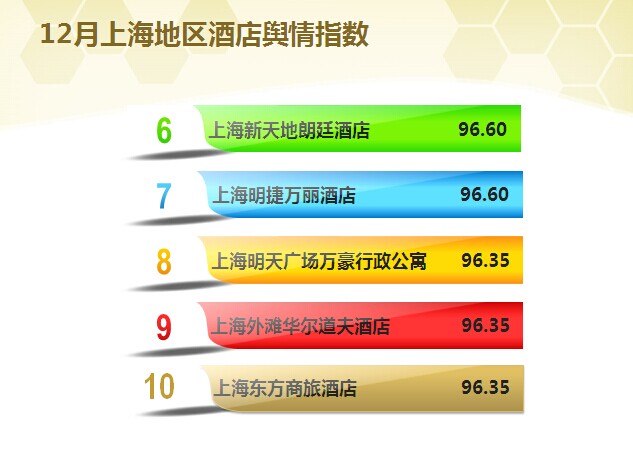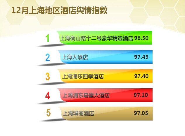 时间:2015-01-16 11:59:34 来源:不详 据上海地区12月份迈点区域酒店舆情指数MCI显示,上海衡山路十二号豪华精选酒店以98.50%的好评率位列第一。 据上海地区12月份迈点区域酒店舆情指数MCI显示,上海衡山路十二号豪华精选酒店以98.50%的好评率位列第一,上海大酒店、上海浦东四季酒店 、上海浦东嘉里大酒店、璞丽酒店等酒店以97%以上的好评率分列2-5位。 一、12月份上海区域酒店最新动态 1. 12月15日,上海中优城市广场首批商户之一万豪国际酒店,在上海扬子江万丽酒店与中优城市广场正式签约。[详细] 2. 继世茂集团旗下 MiniMax 睿选酒店品牌于美国纽约时代广场惊艳亮相后,这一主打个性定制的概念型酒店——上海松江世茂睿选酒店于12月24日正式揭幕。与以往不同的是,酒店是否开业由大众说了算! [详细] 二、 12月份上海区域酒店舆情指数分析 1. 上海区域用户最喜爱酒店TOP10