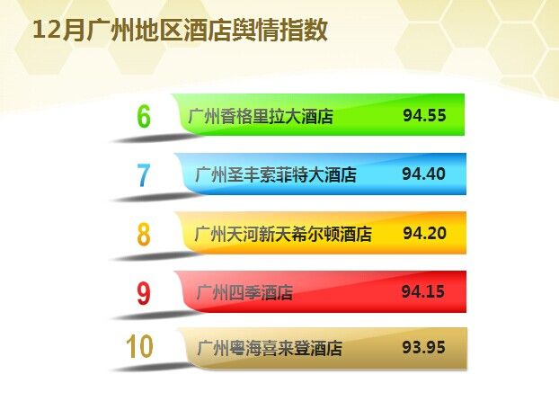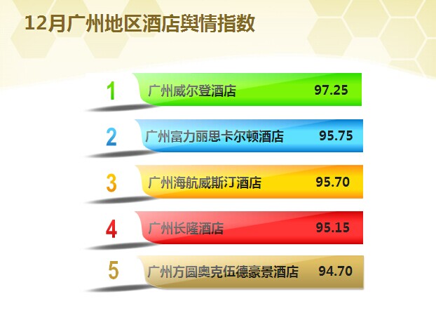 时间:2015-01-16 11:59:36 来源:不详 据广州地区12月份迈点区域酒店舆情指数MCI显示,广州威尔登酒店以97.25%的好评率位列第一,广州富力丽思卡尔顿酒店、广州海航威斯汀酒店 、广州长隆酒店等酒店以95%以上的好评率分列2-4位。 一、12月份广州酒店最新动态 1.12月8日,上海博华国际展览有限公司(HOTELEX Shanghai)、广州市中联实业有限公司联合宣布:由中国旅游饭店业协会指导的“HOTELEXGuangzhou 2015上海国际酒店用品博览会(广州)”将于2015年11月23日至25日拉开序幕。[详细] 2. 12月24日,新天地产集团正式宣布出售广州君誉酒店投资有限公司100%股本权益事项已完成。公开资料显示,广州君誉酒店投资有限公司主要资产为广州一家五星级豪华酒店广州天河新天希尔顿酒店,新天地产将于完成出售事项后终止经营酒店业务。[详细] 二、 12月份广州酒店舆情指数分析 1. 广州用户最喜爱酒店TOP10