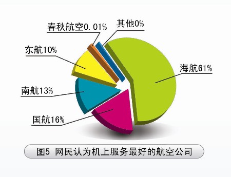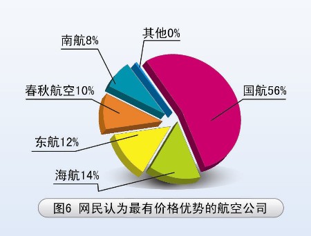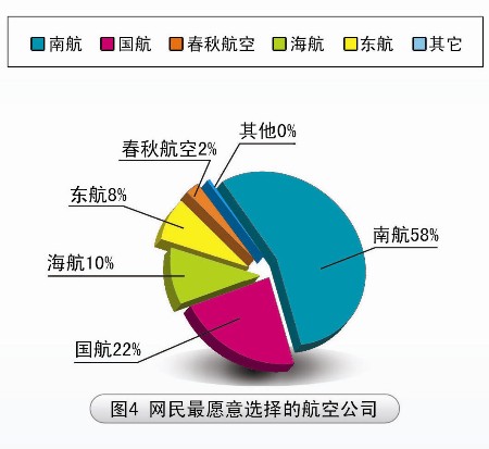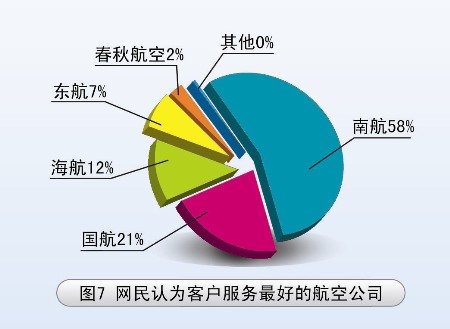 本部分及以下的经济型酒店关注排名和租车公司关注排名,均通过网络调查的方式了解公民意愿,共回收有效问卷3416份。 调查显示,58%的网民首选南航,61%的网民认为海航是机上服务质量最好的航空公司,56%的网民认为国航是最有价格优势的航空公司,58%的网民认为南航的客户服务最好。可见,客户服务是航空公司获得首选的关键。