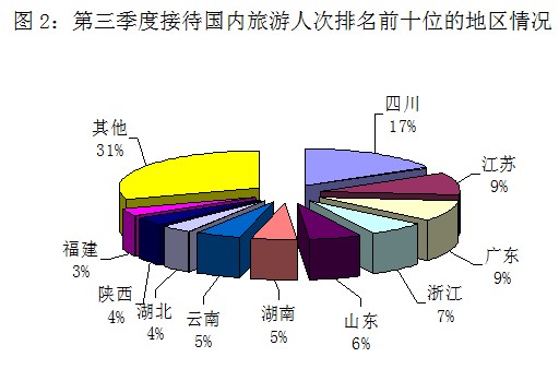 第三季度旅行社组织国内旅游人次排名前十位的地区由高到低依次为广东、四川、浙江、江苏、山东、上海、湖南、湖北[注: 湖北省-湖北省位于中国的中东部,长江中游的洞庭湖以北,故称湖北,简称鄂。湖北省东西长约740公里,南北宽约470公里,面积18.59万平方公里,占全国总面积的1.94%,居全国第16位。]、重庆、安徽[注: 安徽,中华人民共和国东部的省份,简称“皖”。公元1667年因清代江南省(明代南直隶)东西分置而建省。省名取自安庆府、徽州府首字。](见图1)。