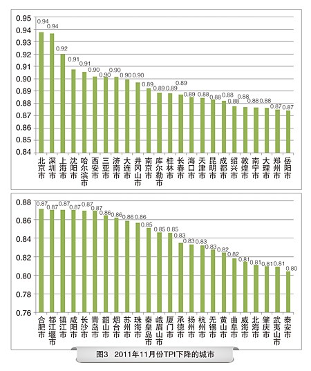 11月份,所选定的50个城市中,2座城市TPI上涨,48座城市TPI回落;上涨的两个城市分别是宁波市(上涨0.9%)、广州市(上涨0.1%);回落最快的五座城市分别是泰安市(回落19.6%)、武夷山市(回落19.1%)、肇庆市(回落19%)、威海市(回落18.6%)、曲阜市(回落18.2%),总体上,随着旅游旺季的结束,各观测城市及景区普遍出现回落。