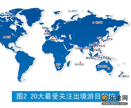 时间:2012-2-5 15:04:19 来源:乐途旅游| 20大最受关注出境游目的地 香港、泰国、澳门、美国、新加坡、马尔代夫、日本、意大利、韩国、法国、马来西亚[注: 马来西亚别名祃涞坹;[马来文:Malaysia、爪夷文:??????],东南亚的国家之一。马来西亚是一个由十三州和三个联邦直辖区组成的联邦体制国家,]、澳大利亚、台湾、印度尼西亚[注: 印度尼西亚共和国(印度尼西亚语:Republik Indonesia),简称印度尼西亚或印尼,别名:因德坭坹,为东南亚国家之一,]、英国、南非、越南、印度、新西兰、俄罗斯