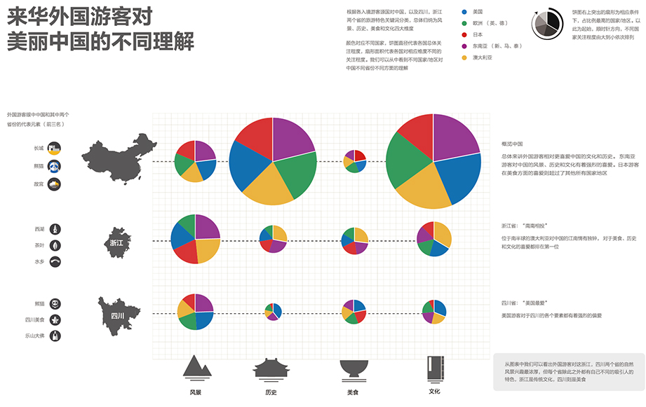 总体来看,除了北京、上海和香港,游客对于中国元素的认知超过了对省份的认知。日本和东南亚总体比其他国家对于中国的省份认知更多。能让外国旅游者印象深刻并记住的多为著名的具体景点和代表元素,如黄河、乐山等。外国游客认为代表中国的还是一些具体的景点和元素,例如:长城、熊猫和故宫。其中对于长城的认知程度总体上高于任何一个省市自治区。 外国游客对浙江、四川两个省的自然风景兴趣最浓厚,但是每个省都有不同的特色。浙江的的传统文化最吸引外国游客。其中,澳大利亚游客对杭州最感兴趣的不是西湖,而是丝绸。在四川,最受外国游客欢迎的则是当地美食。不过美国人相比较其他国家更喜欢成都的名胜古迹,比如都江堰。 来华外国游客的差异 来华外国游客的目的不同。 休闲娱乐是海外游客来到中国的主要目的。以游玩/娱乐/休闲为旅游目的的海外游客比例占到79%,而在37%以商务为目的的游客当中,超过一半的游客有游乐休闲内容。公务游穿插的文化探寻游成为中国旅游的一种特色。