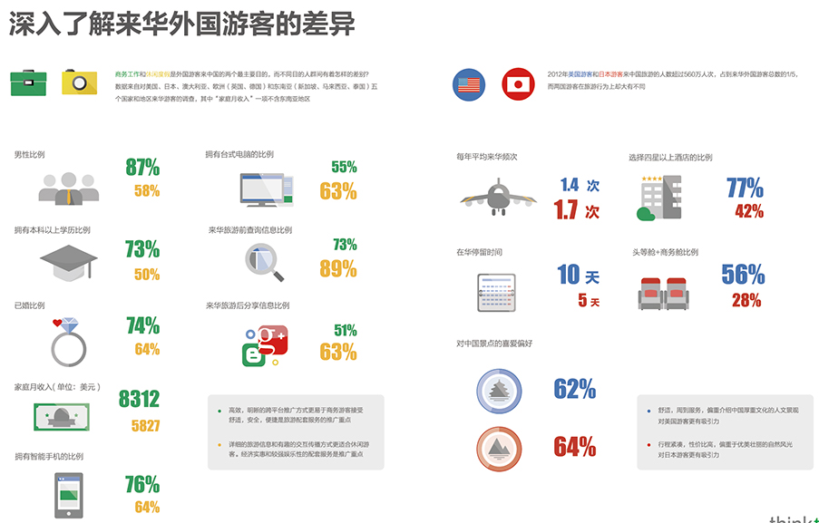 商务出差与休闲度假的游客在行为方式上差异明显。商务游游客中男性占87%,拥有本科以上学历比例达73%,月平均工资为$ 8312。他们拥有更多预算,更频繁地使用智能移动设备,多用笔记本和智能手机采集基本信息;高效、明晰的跨平台推广方式更容易被商务游客接受。舒适、安全、便捷是旅游配套服务的推广重点。在休闲游客中,男性占58%,拥有本科以上学历比例为50%,月平均工资为$ 5827。他们多用台式电脑作为搜索终端,更喜欢信息搜索和分享,并看重配套服务的经济实惠和较强娱乐性。详细的旅游信息和交互有趣的传播方式更适合休闲游游客。 来自不同国家的游客,其旅游行为也有所不同。美国游客来华停留时间长(10天),更倾向选择四星以上酒店,更看重文化和历史。舒适周到的服务,偏重中国文化和历史的宣传对美国游客更有吸引力。而日本游客来华时间短(5天),但频次略高(1.7次/年),且更多选择经济舱,更看重自然风光。行程紧凑、性价比高、偏重于自然风光的宣传对日本游客更有吸引力。 面临如此态势,如何提振中国入境游市场? |