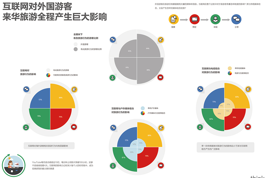 调查显示,互联网在外国游客的旅行中发挥了重要的作用。在旅游的信息搜索、预订、体验和分享等环节中,互联网拥有超过70%的影响力。网络媒体渠道成为被访者最主要的信息收集来源,超过其他媒体。88%的游客会通过互联网获取旅游信息;其中使用搜索引擎进行信息收集的被访者比例最高,达到49%。数据显示,通过搜索引擎进行信息收集的被访者中,92%使用Google。 多渠道营销:全方位吸引外国游客 现在,大家已经认识到互联网传播渠道的重要性,而调查显示,单一的传统媒体对旅游行为的影响远小于其与互联网组合产生的影响。比如在电视和户外媒体的基础上,互联网可以将媒体的影响提高大约4倍。鉴于此,中国旅游目的地除了重视互联网的影响力之外,也要与其他传统媒体进行搭配,推出多媒体组合的宣传策略。 多媒体的传播策略,不仅包括户外、电视等传统媒体,也包括依赖于互联网渠道的移动平台和PC平台。所以,在推广时,可以从各个渠道接触外国游客,最终提升影响力。 |