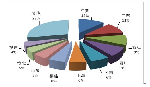 2012年度旅行社国内旅游接待人次排名前十位的省份依次为江苏、广东、浙江、四川、云南、上海、福建、山东、湖北、湖南。(见图2)