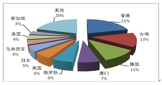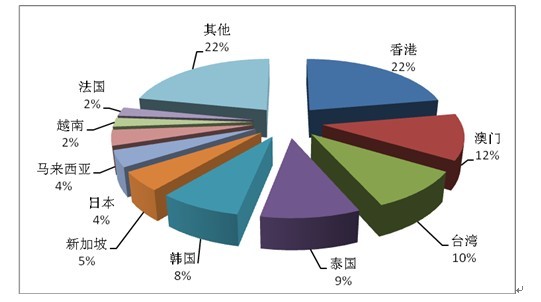 2012年度旅行社入境旅游接待人次排名前十位的客源地国家和地区依次为香港、台湾、韩国、澳门、俄罗斯、美国、日本、马来西亚、泰国、新加坡。(见图5)