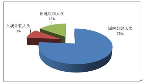 四.三大旅游市场比较 1、三大旅游市场人次数比较 以国内旅游组织人次、出境旅游组织人次、入境旅游外联人次三项指标数据进行比较,2012年度全国旅行社国内旅游、出境旅游、入境旅游所占份额分别为76%、15%、9%,分别同比减少4个百分点、增长3个百分点、增长1个百分点。(见图6) 2、三大旅游市场人天数比较 以国内组织人天、出境组织人天、入境外联人天三项指标数据进行比较,2012年度全国旅行社国内旅游、出境旅游、入境旅游所占份额分别为69%、20%、11%,分别同比减少2个百分点、增长3个百分点、减少1个百分点。(见图7) 总体结构情况 一.数量分布 2012年度旅行社数量排名前十位的省份依次为江苏(1996)、山东(1963)、浙江(1894)、广东(1512)、河北(1252)、辽宁(1141)、河南(1141)、上海(1090)、湖北(1041)、北京(1021),上述省份旅行社数量占全国旅行社总量的56.33%。(详见附件表1) 二.各地经营状况 2012年度全国旅行社组接指标排名前十位的省份依次为广东、浙江、山东、江苏、北京、上海、辽宁、湖南、四川、福建。(详见附件表6) 2012年度全国旅行社主要经济指标(旅游业务营业收入、 |
