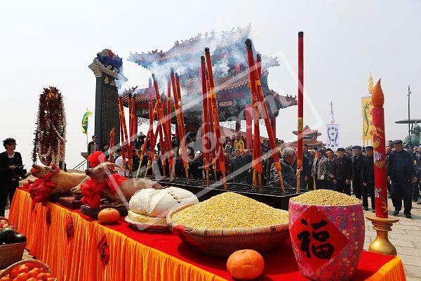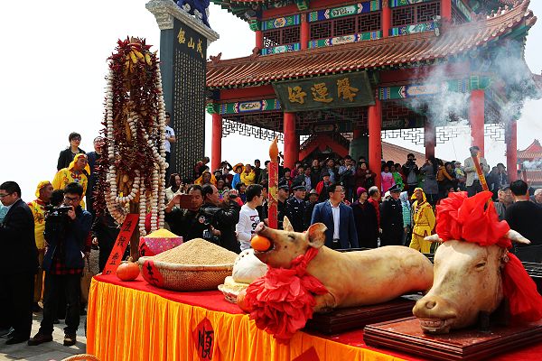 仪式简单依旧 祈愿美好淳朴 一条长约6米的供桌上,贴着红“福”字的面缸里盛满黄豆,团箱里盛满玉米,中间则是红枣饽饽、三牲。供桌两侧,西有“五谷丰登”,东有“连年有余”两根立柱。“连年有余”柱上缀满了成串的对虾干、干鱼,整体插在几盘叠放的渔网上,“五谷丰登”柱挂满了蒜头、玉米、辣椒和地瓜干,通柱立于一老式苇编粮囤子里,囤里堆满了花生。这些当地渔民熟识的物件,却成了远道而来的游客眼中的稀罕之物,纷纷留影纪念。 在阵阵锣鼓声中,祭海仪式正式开始。当地几位老者端酒分敬苍天、厚土、海神。随后,村民和外地游客在长桌前排队焚香烧纸,在摆放五谷和各种干鱼的祭台前焚香跪拜,以求五谷丰登和连年有余。吃会保留了传统祭祀的简单仪式,却承载了乡民对美好生活的祈福向往,摆满了五谷和牲口的供桌、虔诚祭拜的村民吸引了大量游客驻足。